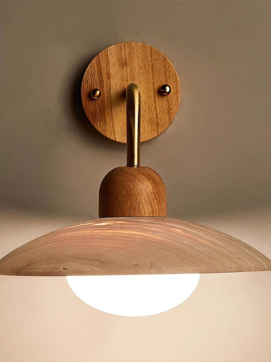 Moderne Travertin Wandleuchte – Scheibenform mit Holz- und Metallelementen